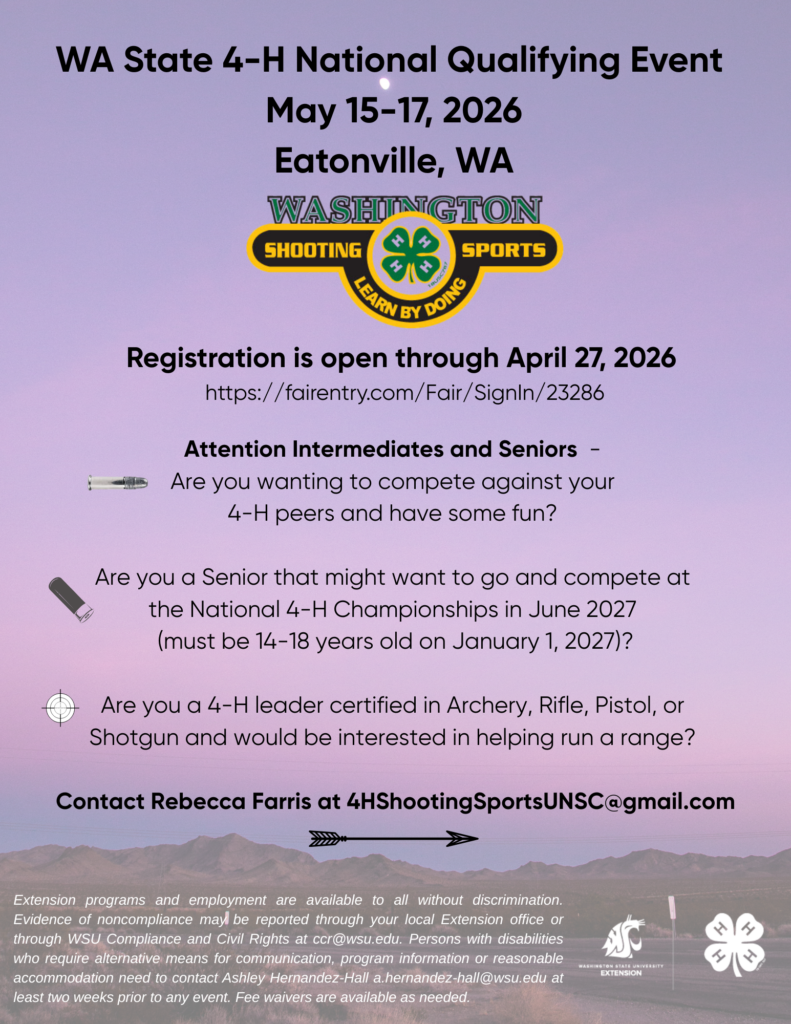 4-H of the Upper Nisqually is hosting the Washington State 4-H National Qualifying Event in Eatonville, WA May 15-17, 2026 for Intermediates and Seniors. Registration is through Fair Entry at https://fairentry.com/Fair/SignIn/23286 and you must use your 4-H Online profile to sign in. The general synopsis and guidelines are all linked on the home page. Registration for smallbore rifle, air rifle, smallbore pistol, air pistol, muzzleloading, compound and recurve archery is $100. Shotgun is #125. Dry camping is available on site for $40 per family for the weekend. The information for ordering event clothing I also listed on the home page.