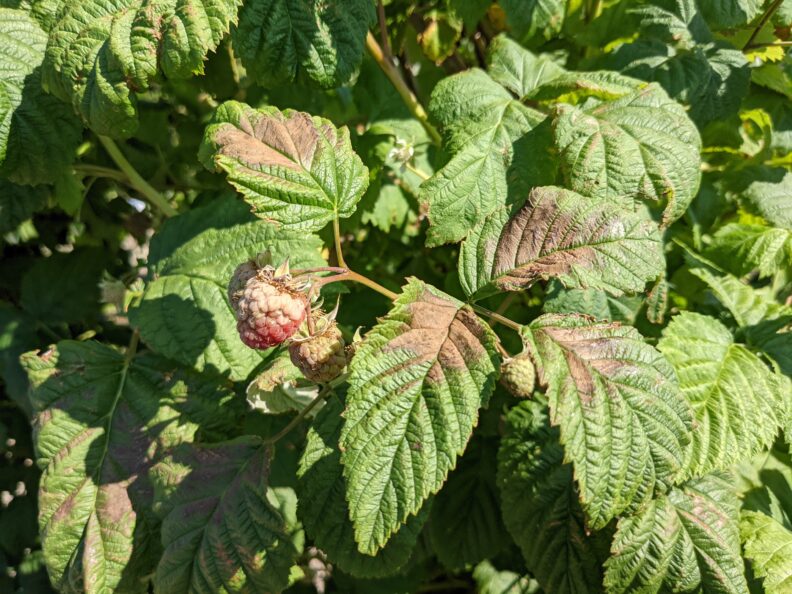 Leaf scorching, and white druplets on a red raspberry plant. Image: Lisa DeVetter