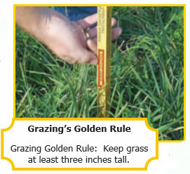 Grazing grass below three inches stresses the plant by reducing the leaf surface which grasses use to make their own food, thus forcing them to use up food reserves in their roots. Eventually, the grass depletes its stored reserves and dies, leaving bare spots in your pastures. Remember the Grazing Golden Rule: Keep grass at least three inches tall.
