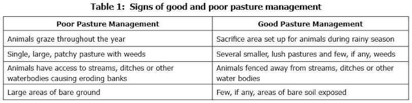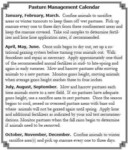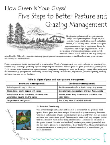 Pasture management should be thought of as grass farming. Think of the grasses as your crop, while you use animals to harvest that crop. Creating a good crop requires recognizing the differences between poor and good pasture management (Table 1). If pastures show characteristics representative of poor pasture management, there are five steps you can follow to improve and better manage your pastures: conducting an inventory, creating a sacrifice area, implementing rotational grazing, mowing and harrowing, and proper fertilizing.
