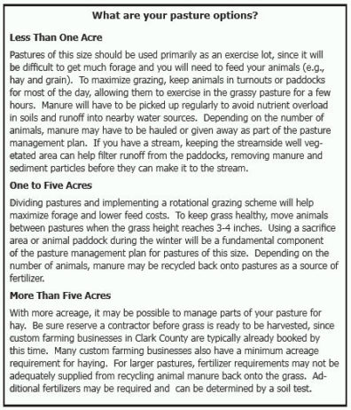 Take a walk through each pasture and conduct an inventory of the grass and weed species, fences, gates, and water troughs. When conducting this inventory, determine what kinds and amounts of grass species currently growing and where they are located. Are there bare areas with no grass? Are some areas made up of only one grass species taller than the rest? Animals may overgraze some areas and under-use others due to the species present. You also need to identify weeds in your pasture, particularly species that may be poisonous to your animals. Clark County Weed Management provides free on-site assistance to identify weeds and the best methods to control them (see Resources section).