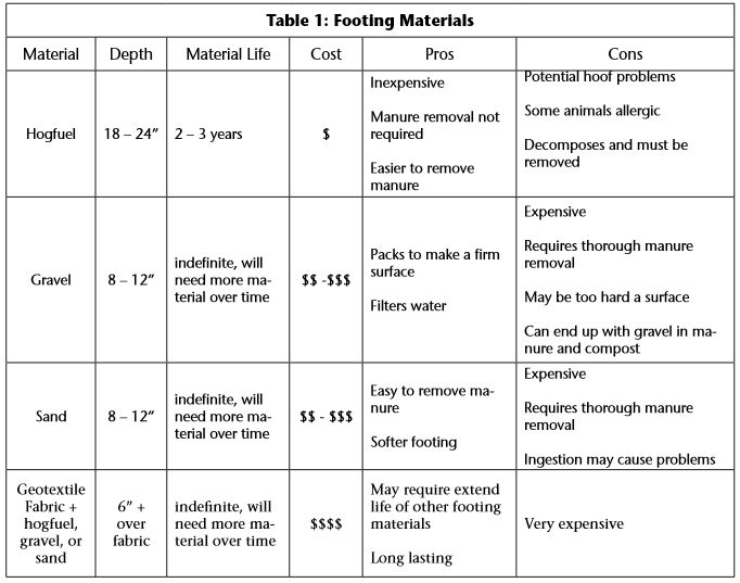 Each type of footing has advantages and disadvantages as outlined in Table 1. It pays to spend some time researching and selecting what works best for your situation. Many livestock owners find that combinations of the footings work best, often with gravel and/or sand covered by hogfuel.