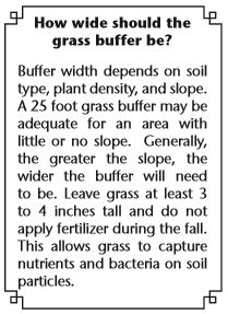 Locate the sacrifice area on high ground to improve drainage and prevent ponding. Locate the sacrifice area near the barn and manure storage to facilitate maintenance and caring for your livestock. To avoid contaminating nearby water sources, avoid locating the sacrifice area near wetlands, streams, ditches, and wells. Planting a vegetated (grass) buffer strip around the sacrifice area will filter sediment particles, manure, nutrients, and bacteria from runoff leaving the sacrifice area.