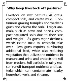 Maintaining good quality pasture and reducing mud on your property requires limiting livestock grazing during the wet, winter months (November to March). This can be done by utilizing a small enclosure such as a paddock, corral, or pen meant to be your livestock’s outdoor living quarters. Called a sacrifice area because it is a small portion of pasture sacrificed for the benefit of the remaining pasture, animals should be confined to the sacrifice area during the