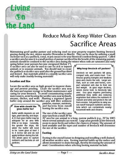 The size of the sacrifice area may vary from a small 20’ by 20’ area for one animal to a long, narrow paddock (e.g., 20’ by 100’) where several animals can exercise. Large areas provide active livestock room to move freely and reduce the chances of injury. The amount of land available and the types and number of livestock will determine the size of the sacrifice.