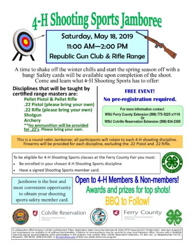 WSU Extension > Ferry County > « All Events This event has passed. 4-H Shooting Sports Jamboree May 18, 2019 @ 11:00 am - 2:00 pm « 4-H Leaders’ Council Meeting North Ferry 4-H Club / 4-H & Open Spring Horse Show » Add to calendar Google Calendar iCalendar Outlook 365 Outlook Live Details Date: May 18, 2019 Time: 11:00 am - 2:00 pm Event Category: 4-H Venue Republic Rifle and Pistol Range Pendry Rd Republic, WA 99166 United States + Google Map Phone: 775-5225 x1116 View Venue Website
