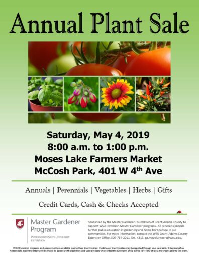 The Master Gardener Foundation of Grant-Adams County fundraising event will have fruit and vegetable plants, flowers, ornamental grasses, house plants, herbs, garden gloves, and more! Many varieties of tomatoes and peppers will be available. Proceeds are used to support and promote the WSU Grant-Adams County Master Gardener Program.