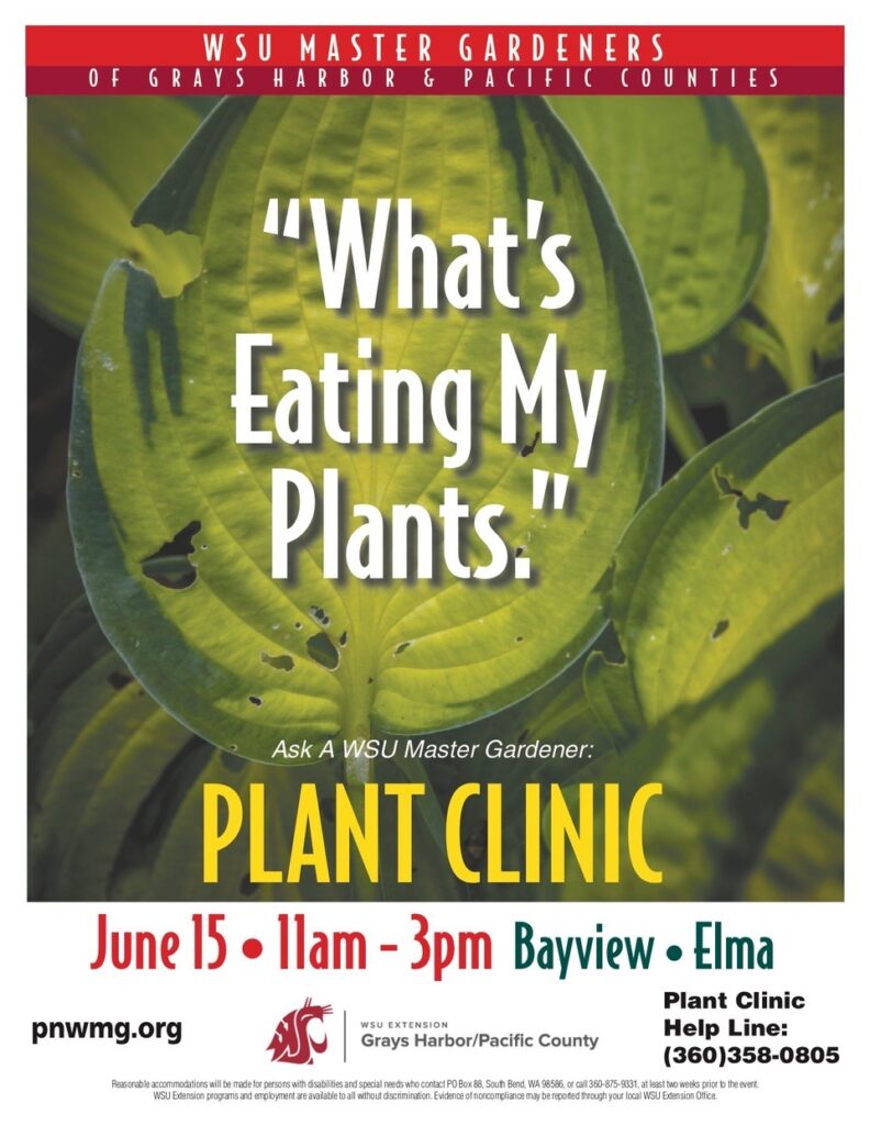 The Master Gardeners of Grays Harbor and Pacific Counties will be hosting a Plant Clinic on Saturday, June 15th from 11:00 AM to 3 PM in Elma at Bayview Building Materials.