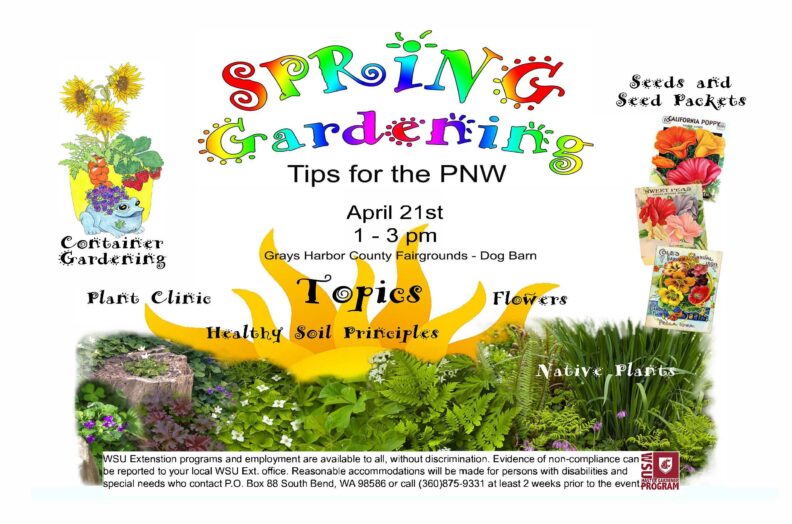Come join the Master Gardener Volunteers of Grays Harbor and Pacific Counties for this two-hour worship, Sunday, April 21st from 1:00 – 3:00 PM. We will cover five different subjects: principles of healthy soils, growing native plants, gardening with containers, flowers and reading seed packets. Master Gardener Volunteers will also be on hand to answer your questions with our Plant Clinic. The workshop is being held at the Grays Harbor Fairgrounds in Elma, in the Borden-Seabert Exhibition Building (aka the Dog Barn).