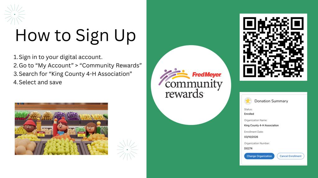 Exciting news, we are now part of Fred Meyer community rewards! A portion of your purchases will go to the association at no extra cost to you. If you are signed up, purchases at ANY Fred Meyer store will count so tell your friends and family.