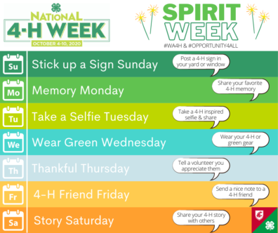 Every year, the first full week of October is celebrated around the Country as National 4-H week in observance of all of the great things the 4-H youth and volunteers work hard to do. To celebrate this year, we invite you to join us for Spirit Week, and send in your pictures via email or share directly on social media!