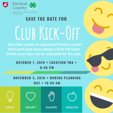 4-H Club Kick-Off Events for 2018-2019 are scheduled on October 1st at 6:30 pm in the 4-H Room at the Klickitat County Fairgrounds.