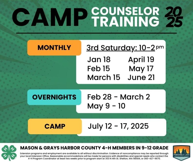 4-H Summer Camp is July 12-17, 2025. 4-H members 8-14 (age as of October 1, 2024) will be able to enroll this spring. Learn more: https://extension.wsu.edu/mason/4-h-youth-families/4-h-camping/