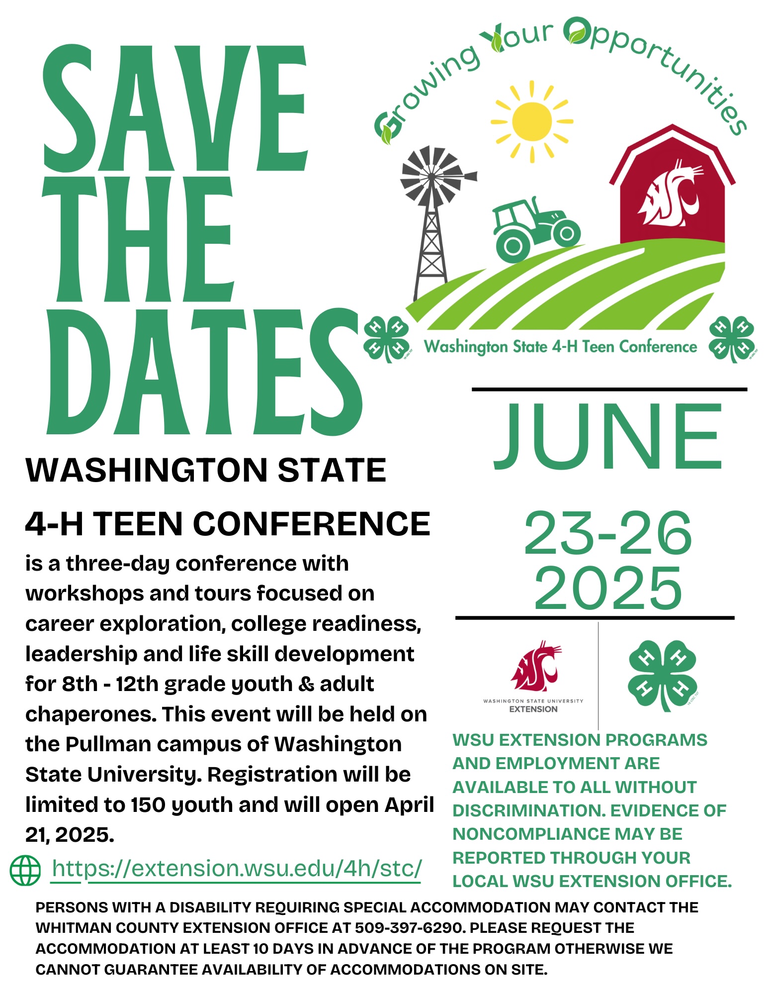 Washington State University Pullman CampusWashington State 4-H Teen Conference is a three-day conference with workshops and tours focused on career exploration, college readiness, leadership and life skill development for 8th - 12th grade youth & adult chaperones. This event will be held on the WSU Pullman campus. Registration will be limited to 150 youth and is open through May […]
