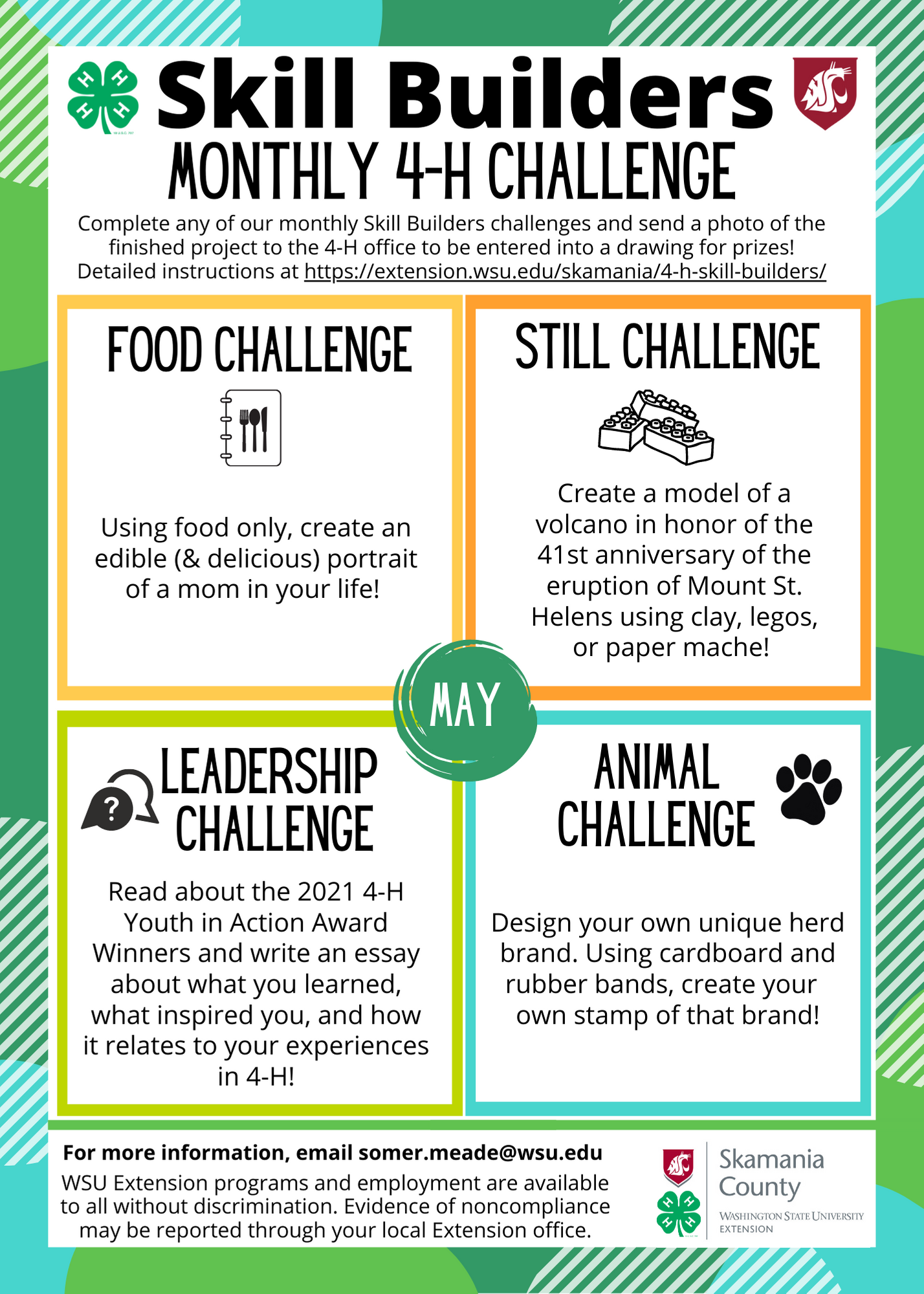 Guidelines for Entering the Contest: 4-H’ers should complete the challenge within the month that it is being offered, and the entry should be a picture or video of the completed project. Those photos can be emailed to somer.meade@wsu.edu by the 3rd of the following month (so March entries would be accepted through April 3rd). Photos may be used for promotional reasons, unless otherwise indicated when submitted. Anyone can complete the monthly challenges, but to be eligible for the raffle, participants need to have enrolled in 4Honline by the May 1st deadline. If you are not affiliated with a club but still want to participate, please contact the 4-H office to find out what you can do.