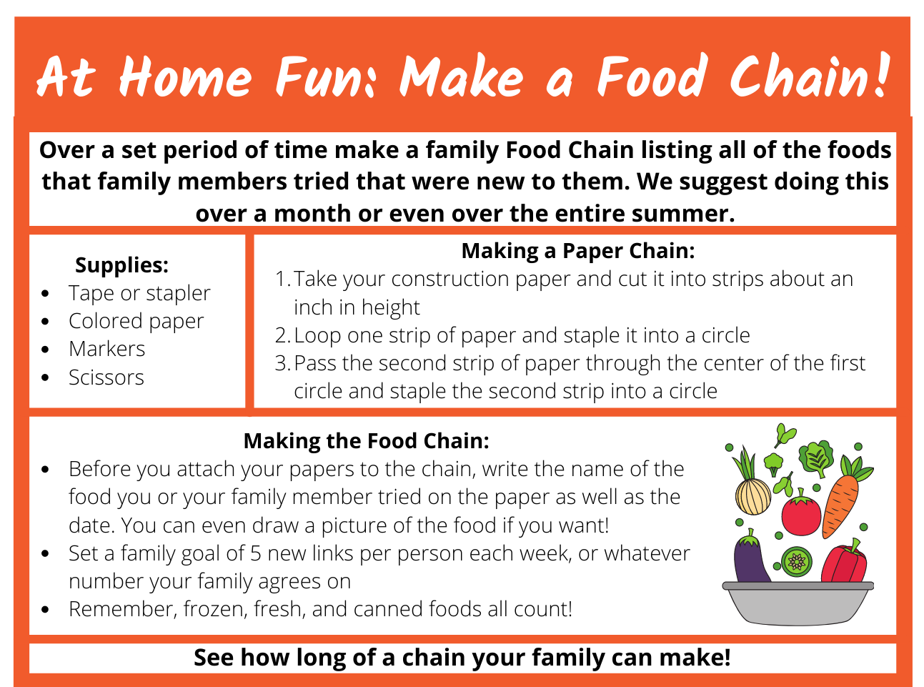 Over a set period of time make a family Food Chain listing all of the foods that family members tried that were new to them. We suggest doing this over a month or even over the entire summer.