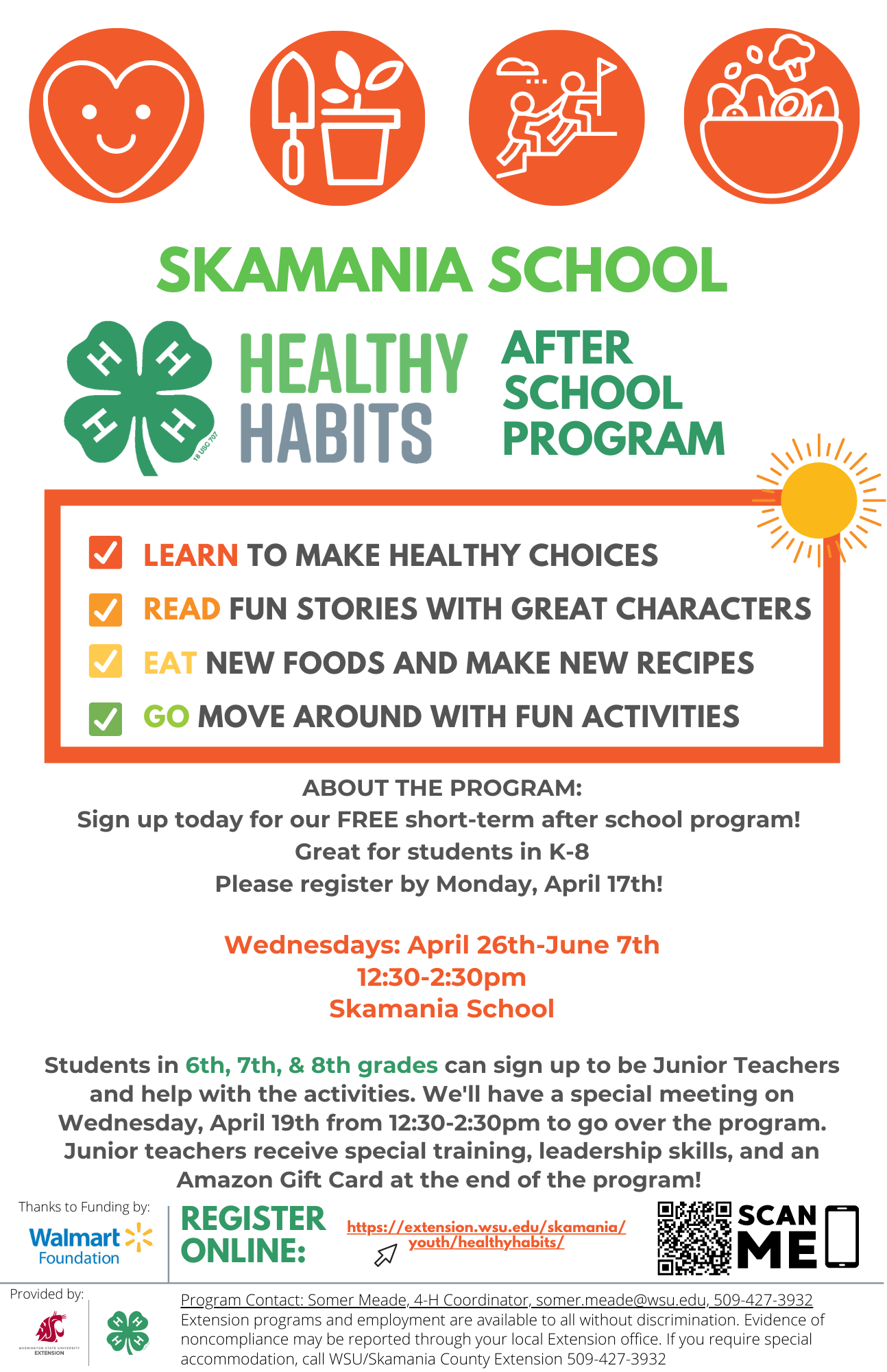 Students will report to the cafeteria immediately after school. Snacks will be provided. Together with our junior teachers, volunteers, and 4-H staff, students will get to read stories, learn about plant and health science and nutrition, make easy & healthy recipes, practice mindfulness, and play!