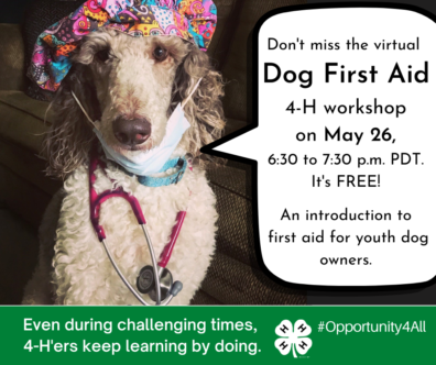 You are invited to attend an introduction to providing basic first aid for your dog on Wednesday, May 26, from 6:30 to 7:30 p.m. Families with dogs are encouraged to attend. You do not have to be enrolled in the 4-H dog project to participate. All who love dogs are welcome! Parents/guardians are asked to attend with children age 9 and younger.