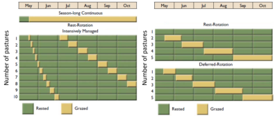 A variety of grazing systems are available to manage animal impact. These include continuous grazing, rest-rotation grazing, deferment grazing, and management-intensive grazing (or variations on rotational grazing), among finer gradations of each.