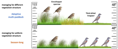 Heterogeneous vegetation structure can be achieved by integrating different grazing systems on different pastures and rotating these systems among pastures over the years. This project in northeastern Colorado on shortgrass steppe shows how adaptive multi-paddock grazing (top panel) is most effective at creating habitat for bird species that prefer tall and medium-height vegetation stature (Grasshopper sparrow; Song sparrow preferences approximately equivalent in Puget prairies), but less effective at creating habitat for species preferring short-stature (Thick-billed longspur. Season-long continuous grazing on productive soils (bottom left panel) is moderately effective at creating habitat for bird species that prefer tall and medium-height vegetation stature, while the same season-long grazing on low-productivity soils was highly effective at creating habitat for bird species preferring short-cropped vegetation. In the diagram, more birds indicates better habitat outcomes. Combined, these two grazing systems are more effective than when used alone, in creating habitat for bird species with divergent preferences. Figure from Raynor et al. (2022).