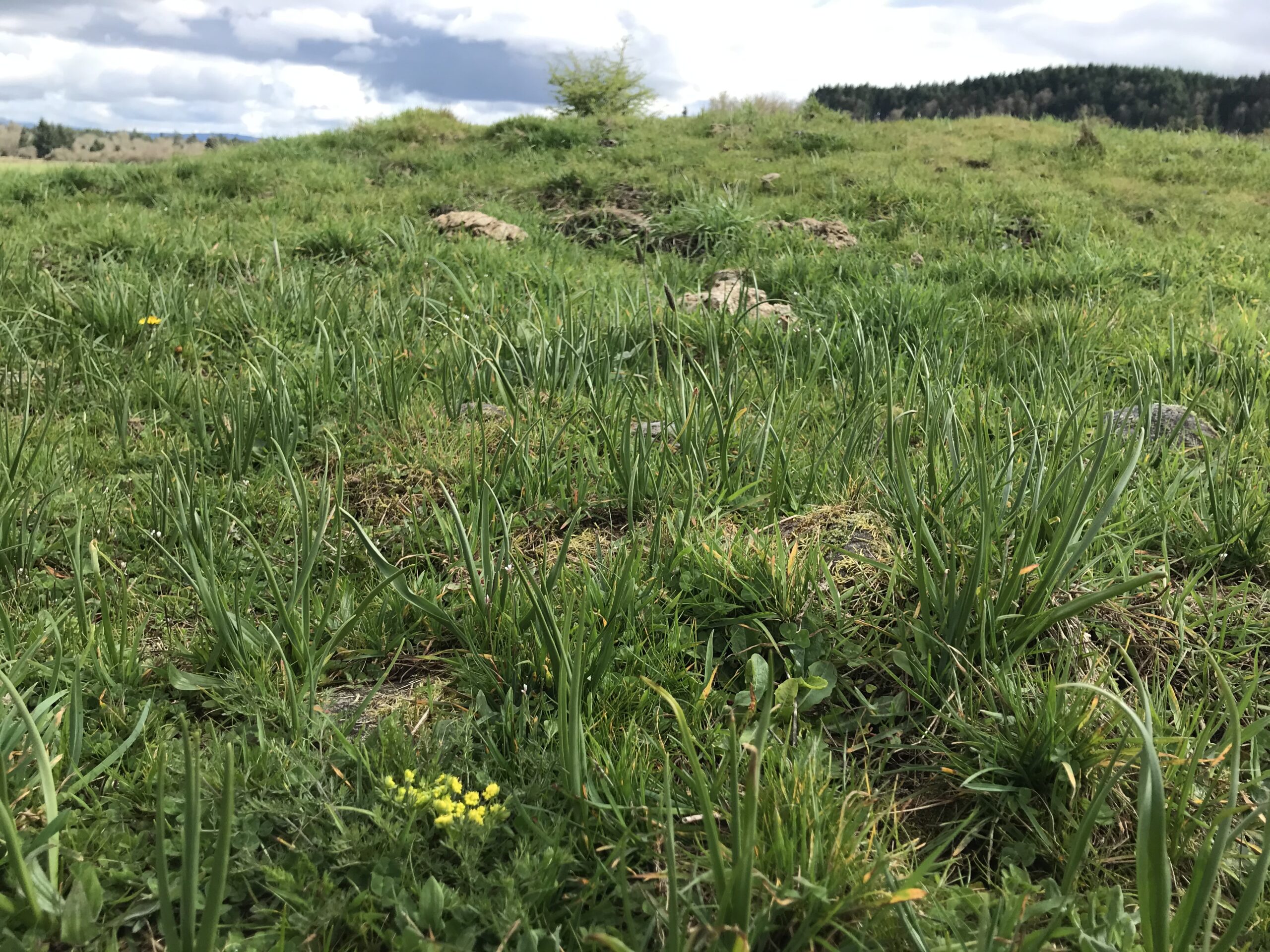 The key to understanding how to apply proper stocking densities is to have clear goals. Whereas high stocking rate and utilization rate can negatively affect regrowth and thus reduce overall forage productivity, this same effect can be applied purposefully to reduce the competitive exclusion by cool-season grasses of native forbs. In Figure 1, a high stocking rate was applied in February-March prior to peak bloom of native forbs to purposefully set back non-native perennial grasses and allow light and room for Spring gold (Lomatium utriculatum) and Common camas (Camassia quamash, picture above as clumps of thick, grass-like leaves). The process has sometimes been referred to as “managed over-grazing”, but that is perhaps a misnomer, as the high grazing pressure is set on purpose to match the habitat objective, and thus is not excessive. A deferment began in mid-March 2022 (photo taken March 28th) following heavy grazing. Under continued deferment through May or early June, this field will become a carpet of Camas and Spring gold blooms and produce substantial seed.