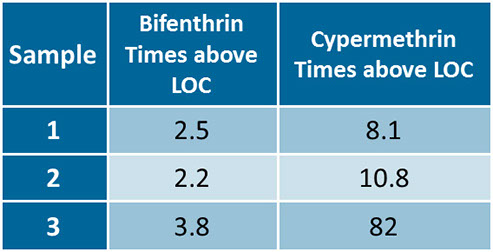 Streambed sediment samples taken from three sites within the crayfish kill incident area had significant detections of two pesticides, bifenthrin and zeta-cypermethrin (hereafter referred to as cypermethrin). Each detection was compared to a Level of Concern (LOC) to assess whether or not these levels of bifenthrin and cypermethrin had the potential to harm non-target organisms in the creek [1]. Any concentration that meets or exceeds the LOC indicates a high risk of acute toxicity to non-target organisms. Every sample tested contained concentrations well over the LOC for both compounds. Table 1 displays how much each sample exceeded the LOC. For example, the concentration of cypermethrin for Sample 3 was 82 times above the LOC. The crayfish tissue residue analysis results indicate that cypermethrin was present in the tissue of the crayfish.