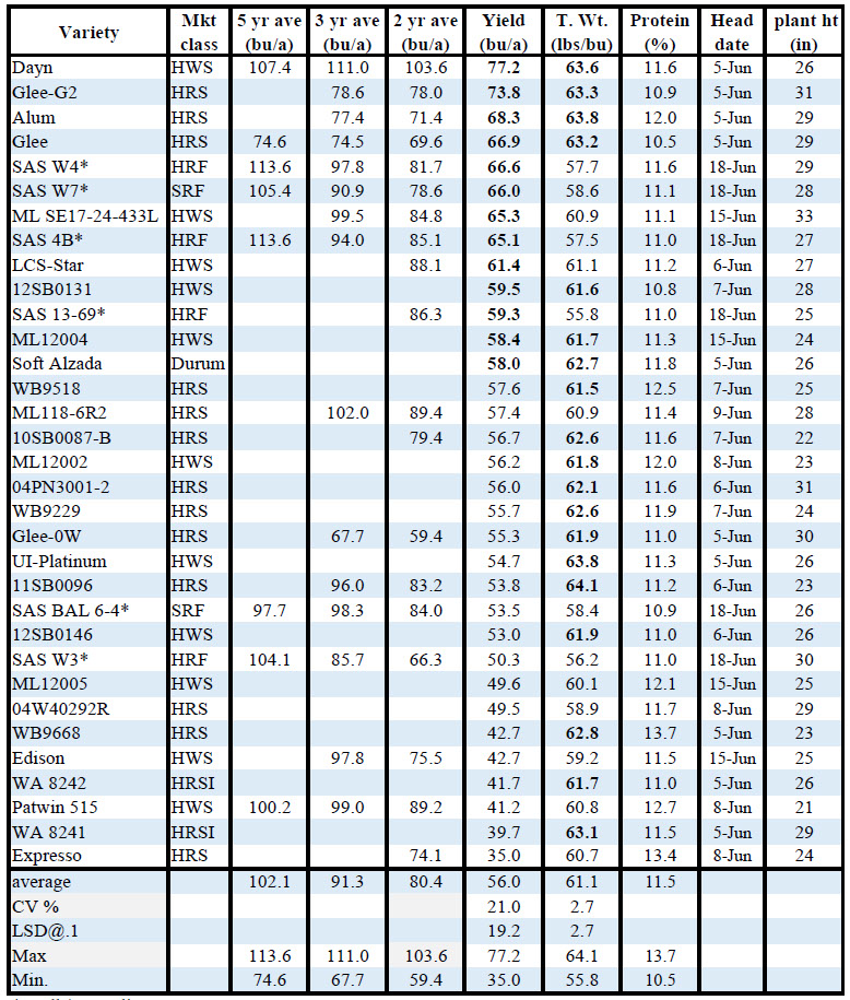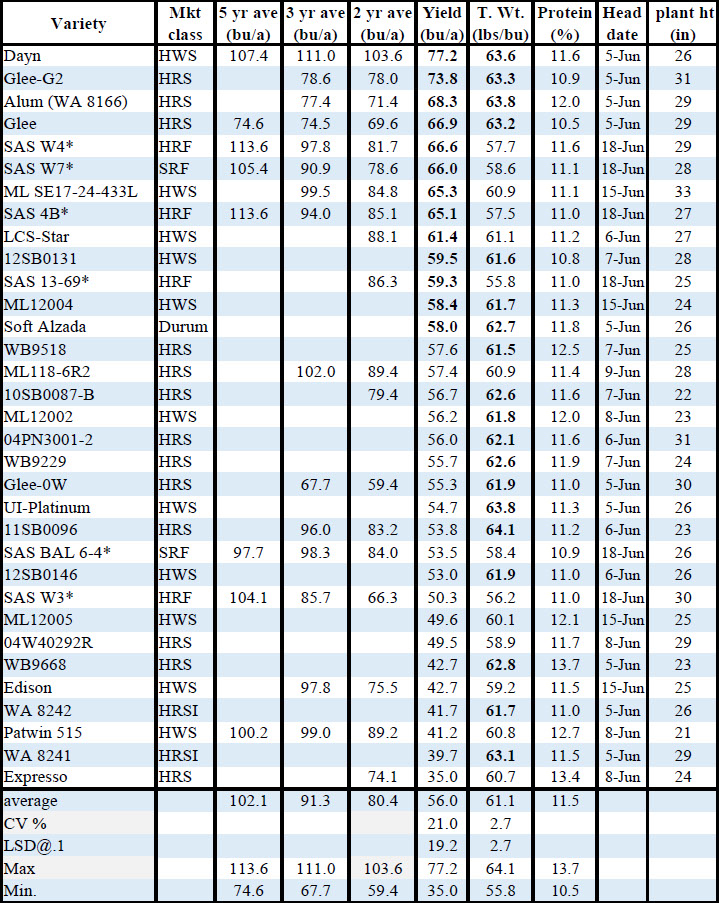 3. Harvest was on July 21 and yields ranged from 16.2 to 120.7 bushels/acre, test weights 47.8 to 58.2 lbs/bu and protein 10.3 to 15.3 %. Values within the 10% LSD range of the largest are shown in bold.