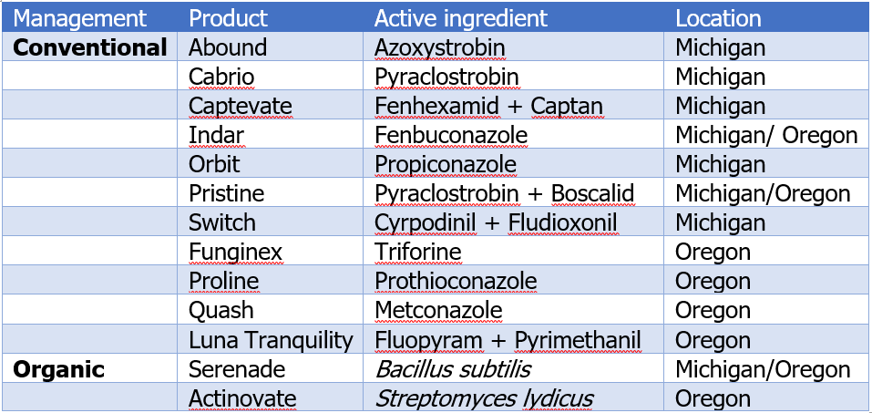 *Data obtained from Pscheidt 2014 and Schilder et al. 2008.[/textblock][/column][/row][row][column][textblock]WSU Small Fruit Pathology – Current research