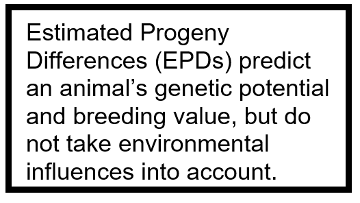 EPDs are a prediction of the breeding value of an animal; they predict probabilities of differences between the offspring of two individuals being compared, or between an individual’s offspring and those of the breed average. Each breed has its own EPDs; EPDs can’t be compared between breeds, even between red and black angus beef cattle. EPDs help predict the genetic potential of an animal and how its offspring are expected to perform without taking environmental or management influences into consideration.