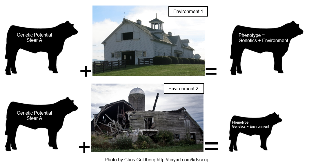 EPDs are generated using statistical models that remove environmental influences and other factors such as management systems, gender, age, etc. However, animal performance ultimately relies on both genetic and environmental factors. As depicted schematically below, an animal with EPDs for a certain level of performance (growth rate, carcass traits, etc.) may or may not live up to its genetic potential if its environment is sub-standard. Nutrition, sanitation, stress, disease prevalence, and so on can result in animals falling well below what they could have achieved under better management.