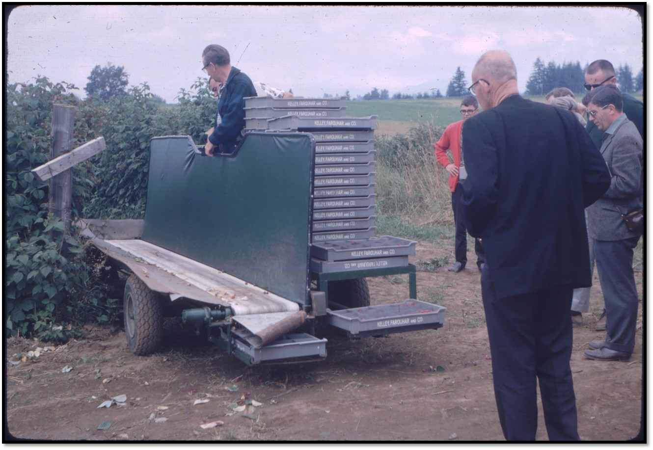 “The acreage of raspberries has increased until it has been estimated there are over 1000 acres in production. The growers greatest concern at the present time is the picking situation. At the schools, the growers were very much interested in picking machines. A commercial picking machine was used on one farm. The grower was satisfied with the operation of the machine. After the hand pickers had gone through the rows, the machine was used to determine the efficiency of the pickers. It was determined that the machine salvaged a sufficient tonnage of berries to make the operation very profitable.”