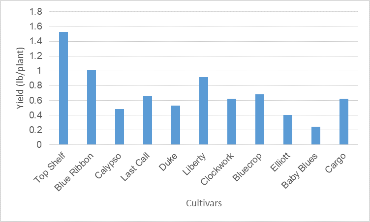Figure 2. Average yield per plant, 2017. Note ‘Baby Blues’ (ORUS 10-1) is being re-named ‘Mini Blues’.