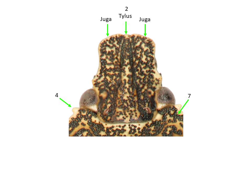 - There are 5 antennal segments. The base of segment 5 and tip of 4 are pale.
