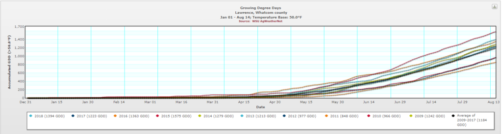 Growing Degree Days (Base 50F), 2009 – 2018, Lawrence Weather Station. Source, WSU AgWeatherNet Click on Image for a larger version