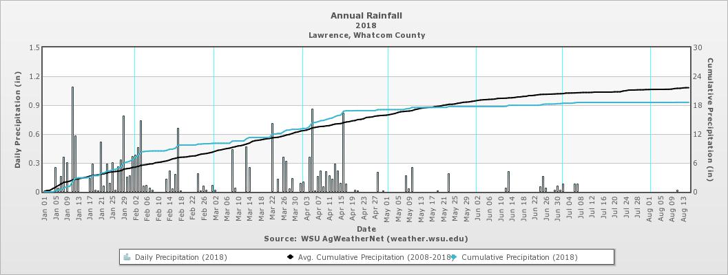 Daily Precipitation (2018), Cumulative Precipitation (2018), and Average Cumulative Precipitation (2008-2018), Lawrence Weather Station. Source, WSU AgWeatherNet .  Click on Image for a larger version