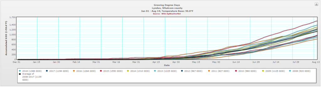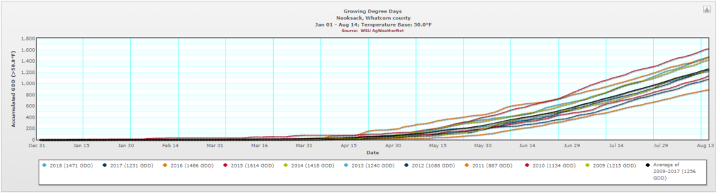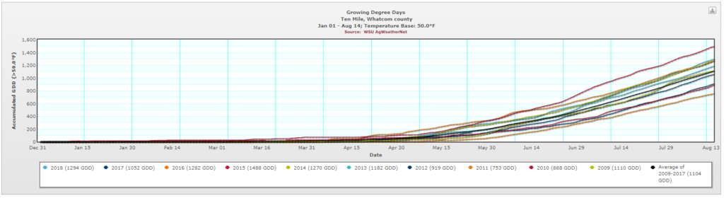 Growing Degree Days (Base 50F), 2009 – 2018, Lynden Weather Station. Source, WSU AgWeatherNet Click on Image for a larger version