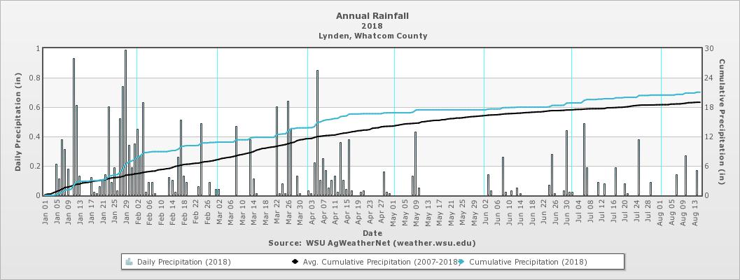 Daily Precipitation (2018), Cumulative Precipitation (2018), and Average Cumulative Precipitation (2008-2018), Lynden Weather Station. Source, WSU AgWeatherNet Click on Image for a larger version