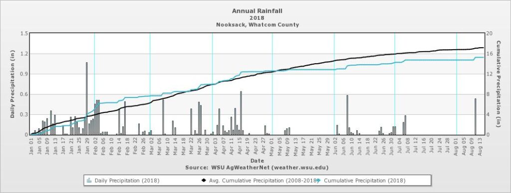 Daily Precipitation (2018), Cumulative Precipitation (2018), and Average Cumulative Precipitation (2008-2018), Nooksack Weather Station. Source, WSU AgWeatherNet Click on Image for a larger version