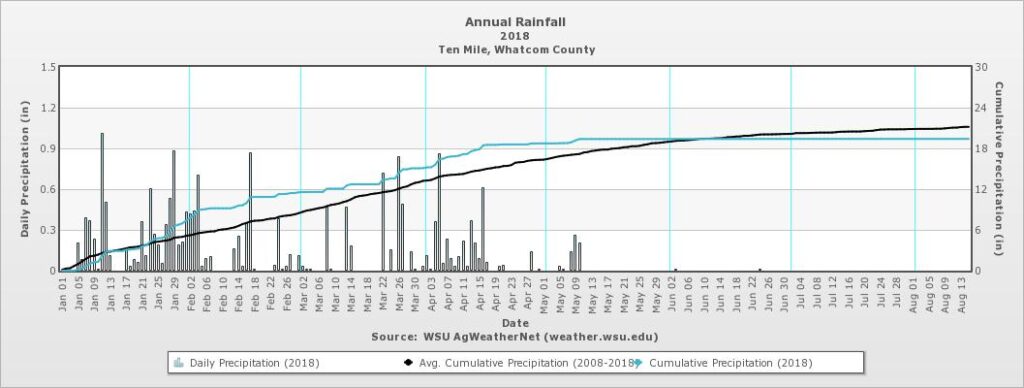 Daily Precipitation (2018), Cumulative Precipitation (2018), and Average Cumulative Precipitation (2008-2018), Ten Mile Weather Station. Source, WSU AgWeatherNet Click on Image for a larger version