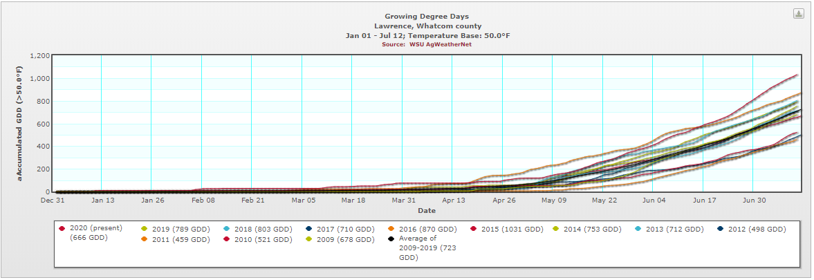 • Accumulated GDD between 4/15/20 and 5/15/20 accounted for 40% of the total GDD to date. Between 2009-2019, April accounted, on average, for only 15% of accumulated GDD by 7/12.