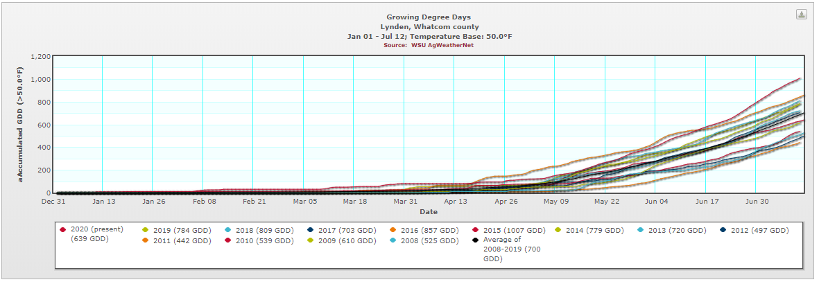 Growing Degree Days (Base 50F), 2009 – 2020, Lynden Weather Station. Source, WSU AgWeatherNet Click on Image for a larger version