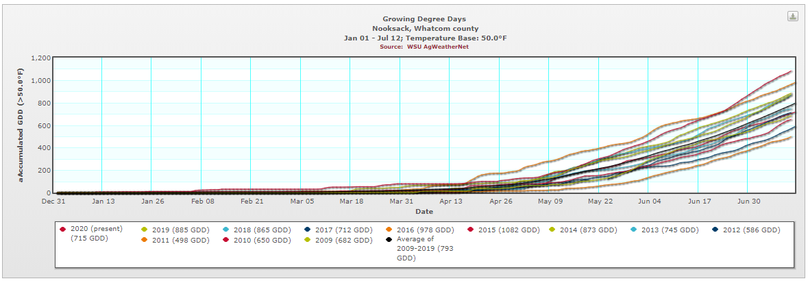 Growing Degree Days (Base 50F), 2009 – 2020, Nooksack Weather Station. Source, WSU AgWeatherNet Click on Image for a larger version