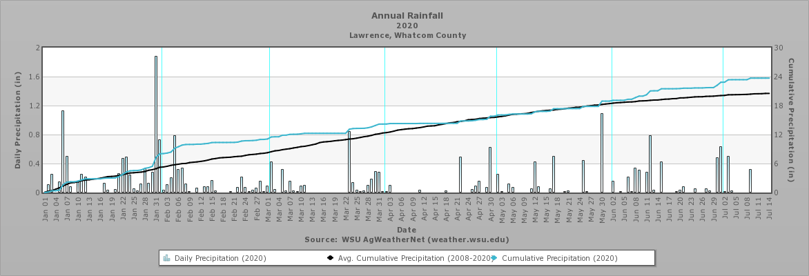 Daily Precipitation (2020), Cumulative Precipitation (2020), and Average Cumulative Precipitation (2008-2020), Lynden Weather Station. Source, WSU AgWeatherNet Click on Image for a larger version
