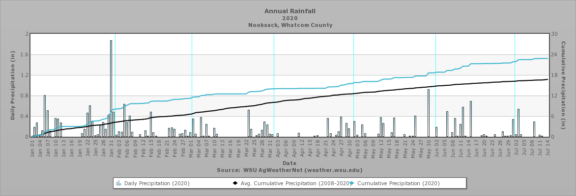 Daily Precipitation (2020), Cumulative Precipitation (2020), and Average Cumulative Precipitation (2008-2020), Nooksack Weather Station. Source, WSU AgWeatherNet Click on Image for a larger version