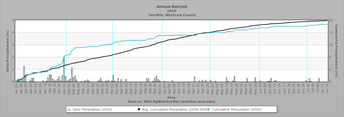 Daily Precipitation (2020), Cumulative Precipitation (2020), and Average Cumulative Precipitation (2008-2020), Ten Mile Weather Station. Source, WSU AgWeatherNet Click on Image for a larger version