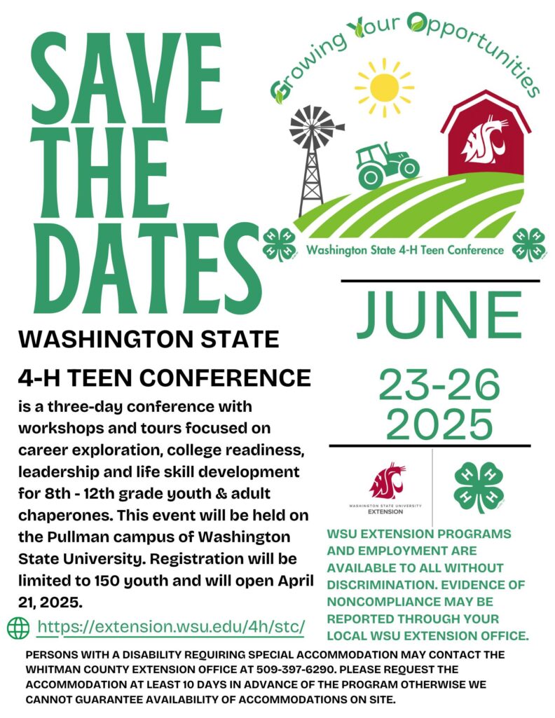 Washington State 4-H Teen Conference is a three-day conference experience at WSU Pullman with workshops and tours focused on career exploration, college readiness, leadership, and life skill development. The conference is open for 8th-12th grade youth and takes place from June 23-26. Registration will open on April 21, 2025, and is limited to 150 youth. More information to follow!